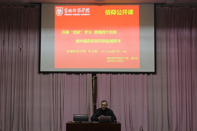 深入贯彻落实习近平总书记关于深入学习党史、新中国史、改革开放史、社会主义发展史的重要指示精神,持续深化爱国主义教育,11月23日晚,教育科学学院在通榆校区国际会议中心举办开展“四史”学习,增强“四个自信”专题讲座,教育科学学院退休教授许友根作了题为《新中国历史研究的盐城样本》的专题讲座。教育科学学院学生入党积极分子、学生党员、学生干部、团支书等300余人现场聆听了讲座,讲座由教育科学学院党总支副书记、副院长魏哲峰主持,本次活动由教育科学学院关工委承办。