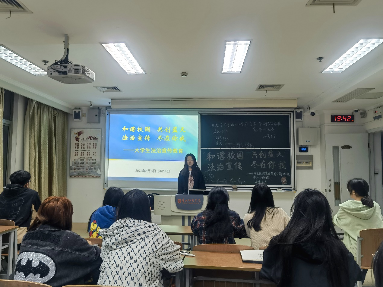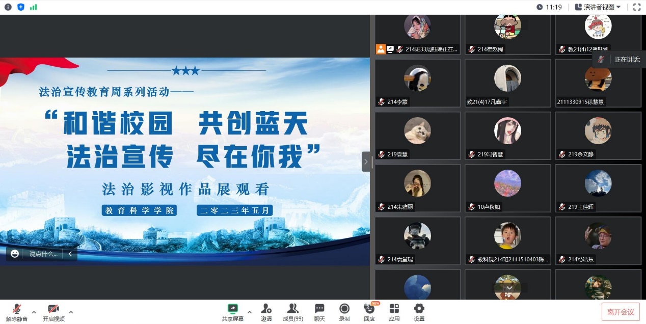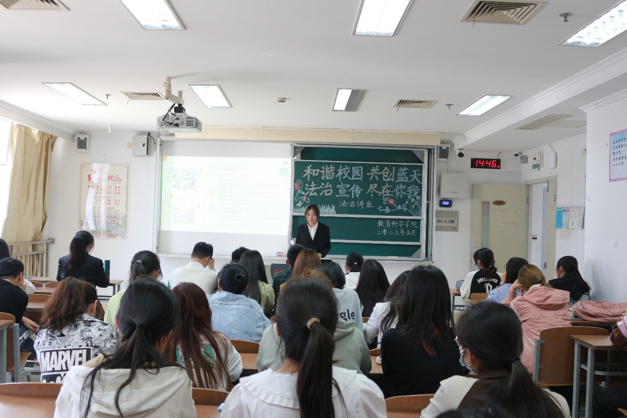 2023年5月8日至14日是第五届大学生法治宣传教育周,为进一步加强我院法治宣传教育工作,增强学生的法律知识和法治观念,推动习近平法治思想深入人心,引导学生运用法律武器维护自身合法权益,教育科学学院深入开展“五个一”法治教育系列活动。