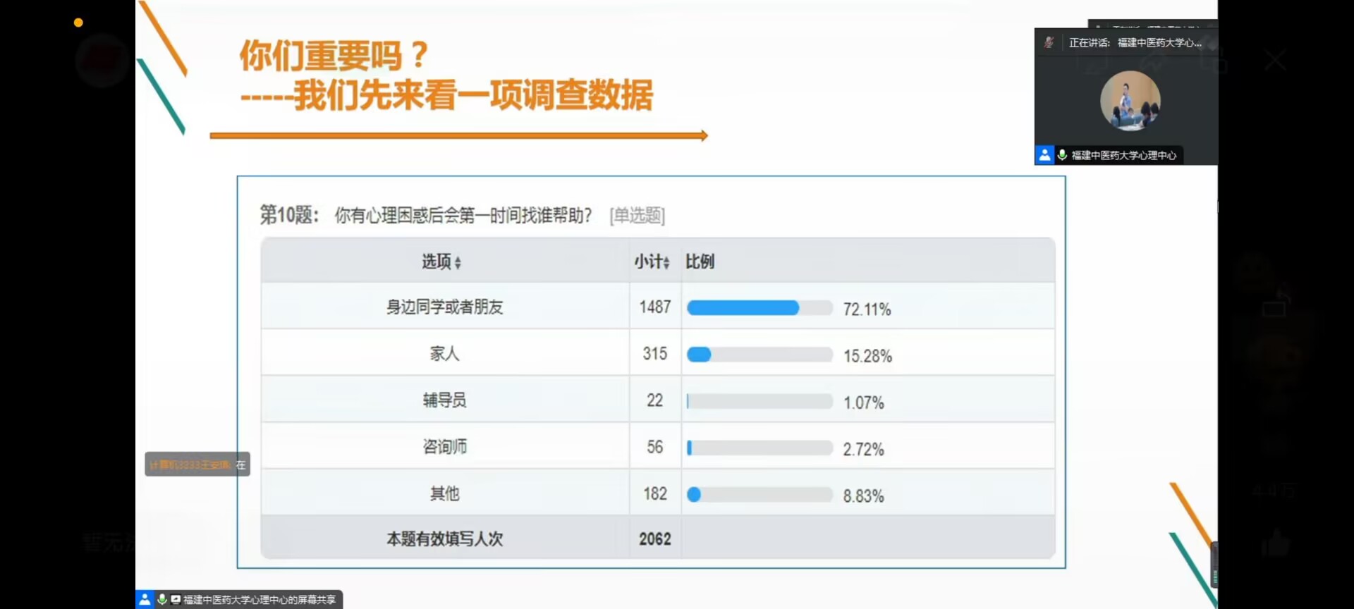 丁闽江教授首先借助一个已完成的调查问卷,引起大家对宿舍心理信息员工作的重视。从问卷出发,丁教授帮助我们分析了一些大学生活中可能遇到的困难和可能会经受的挫折,提出了一些解决方法。