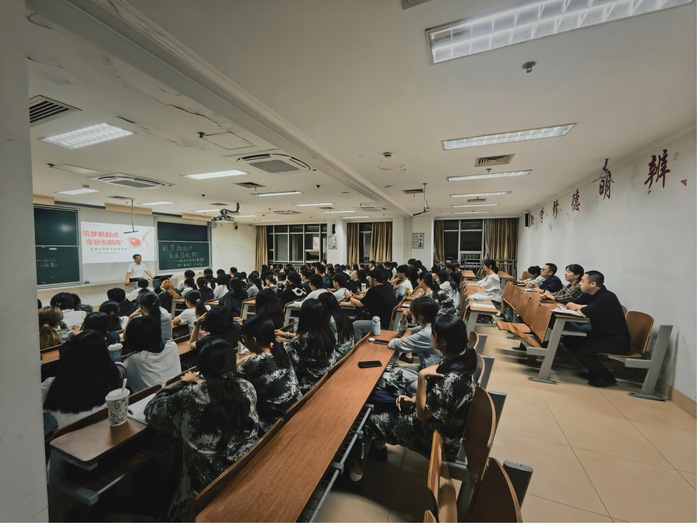 在应用心理学专场讲座中,戴斌荣教授结合心理学学科前沿动态与行业发展趋势,从专业定位、学校平台、学院资源三个维度,系统阐释学院办学优势与专业发展脉络。在学业规划指导环节,他以“飞机升空”为生动喻体,寄语新生“唯有持续夯实知识储备、锤炼专业技能,方能积蓄足够动力飞向学业与职业的高远未来”,并将专业知识体系清晰拆解为“理论奠基、方法支撑、应用实践”三大模块,为新生构建起系统化的学习框架。互动交流阶段,戴教授针对新生普遍关切的就业方向、学习方法、技能提升路径等问题耐心解答,现场互动频繁、氛围热烈融洽。