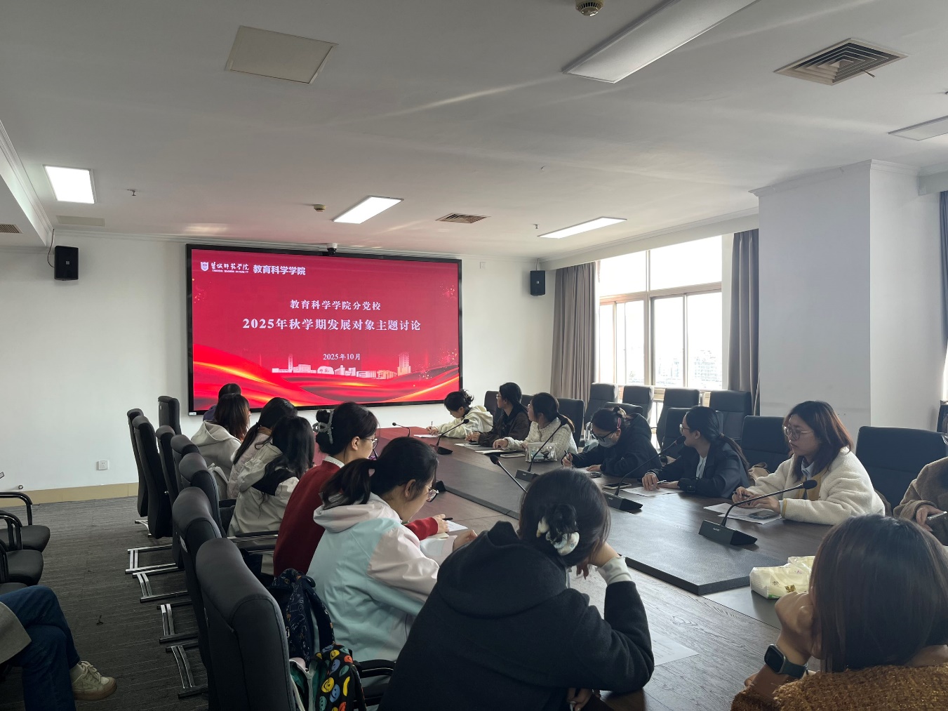10月22日中午,教育科学学院在主楼1108会议室开展了2025年秋学期发展对象主题讨论活动。本次讨论由教育科学学院组织员潘虹主持,2025年秋学期全体发展对象参与讨论。