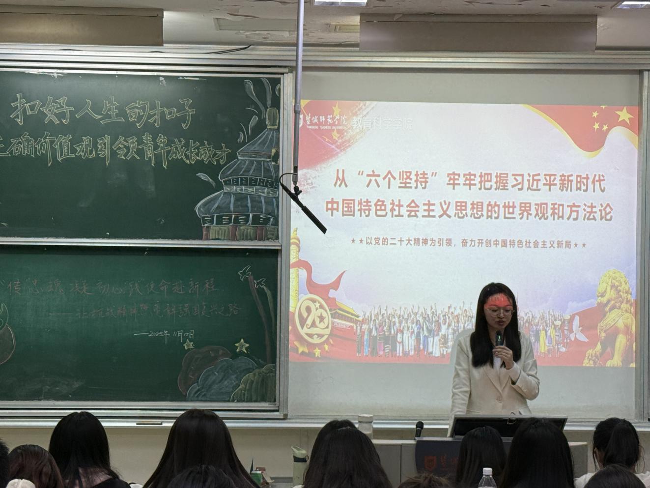 11月12日下午4点50分,教育科学学院在主楼B211开展了2025年秋学期入党积极分子培训班第七次党课培训。本次党课由教育科学学院团委副书记、学生第三党支部书记贺子君主讲。