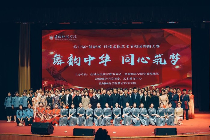 12月14日,第27届“创新杯”科技文化艺术节“舞韵中华,同心筑梦”校园舞蹈大赛在新长校区大学生活动中心举办。盐城市委统战部副部长、市民宗局局长、党组书记、一级调研员黄斌,市民族宗教事务局党组成员、副局长陈铁汉,市民族宗教事务局党组成员、副局长王谋,学校副校长徐华,学校党委常委、统战部部长费正皓出席活动。