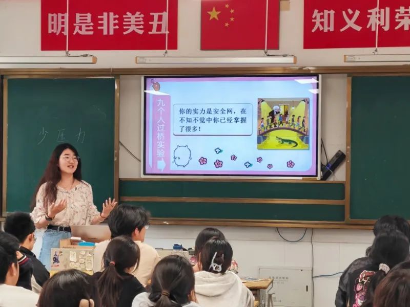 老师通过“九个人过桥实验”让学生们深刻感受到心理暗示对情绪的影响。实验一开始,学生们如履平地地通过一座“桥”,没有任何压力。然而,当老师打开灯光,展示出“桥下的鳄鱼”时,学生们的心理发生了剧变,从容自信瞬间转变为恐惧不安。该实验让学生们认识到,面对压力时,自己对未知的恐惧往往比实际情况更加严重。接着,老师向大家展示了如何通过心理暗示缓解压力。通过想象走过坚固的铁桥,学生们逐渐意识到,不是情境的改变,而是我们如何调整自己的心态,才能克服内心的恐惧。“就像大家复习时的知识储备一样,你们已经在不知不觉中积累了强大的力量。你们的‘安全网’就是这些知识和身边人的支持,”老师总结道。