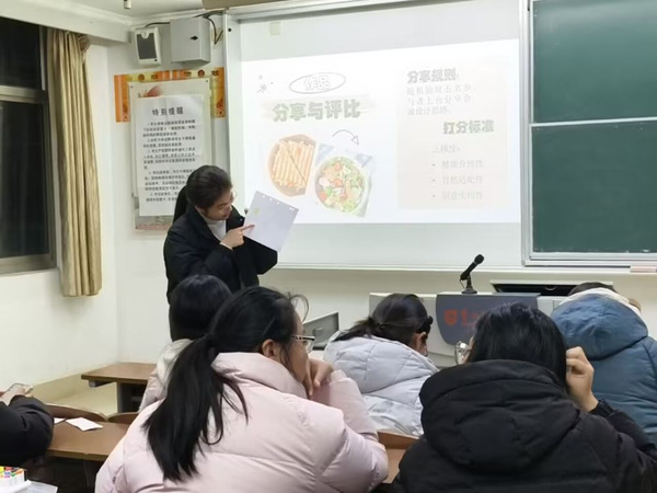 活动以知识讲解开篇,主持人聚焦四季食材特性、饮食生态关联及健康搭配原则展开分享。随后的“自然饮食知识问答”环节,同学们通过踊跃抢答快速巩固了理论基础。在“自然食谱创意设计”环节中,大家结合所学构思绘制专属健康食谱,并清晰标注食材的季节性、热量估算、自然关联及核心做法。最终由5名同学代表,从生态友好、营养均衡、创意巧思等角度分享创作思路,现场反响热烈。