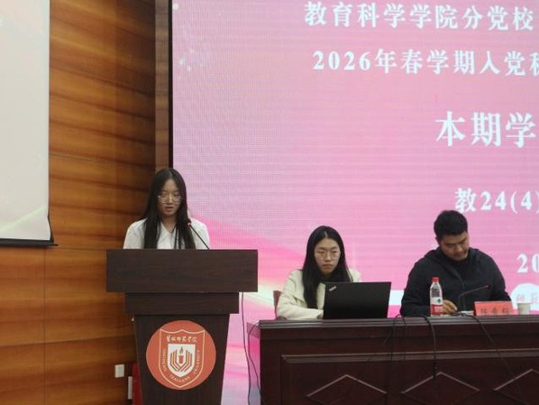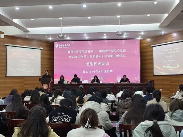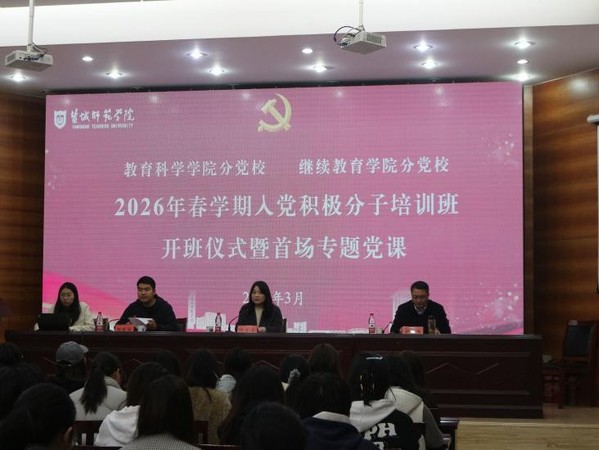 3 月 25 日下午 3 时,教育科学学院党委与继续教育学院党总支在国培报告厅隆重举行 2026 年春学期入党积极分子培训班开班仪式暨首场主题党课。教育科学学院党委书记杨日晨、继续教育学院党总支书记刘井飞、教育科学学院党委副书记陈希强出席活动,培训班全体学员参加,开班仪式由陈希强主持。