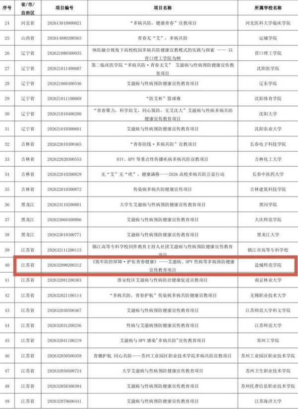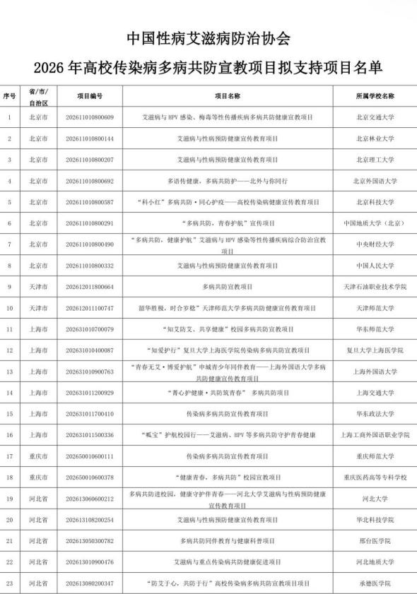 近日,中国性病艾滋病防治协会公布2026年高校传染病多病共防宣教项目拟支持项目名单,教育科学学院《筑牢防控屏障·护佑青春健康》健康宣传教育项目成功入选。