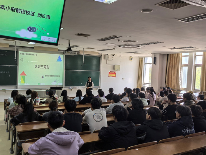 讲座伊始,刘红梅以苏教版四年级下册《认识三角形》为课题,结合小学生认知特点,呈现了一堂高质量小学数学示范课。她遵循“从实例到抽象”思路,从生活场景切入,引导学生通过观察、实操掌握三角形定义、各部分名称及底和高的含义,巧妙突破教学难点,让师范生直观感受一线课堂教学方法。